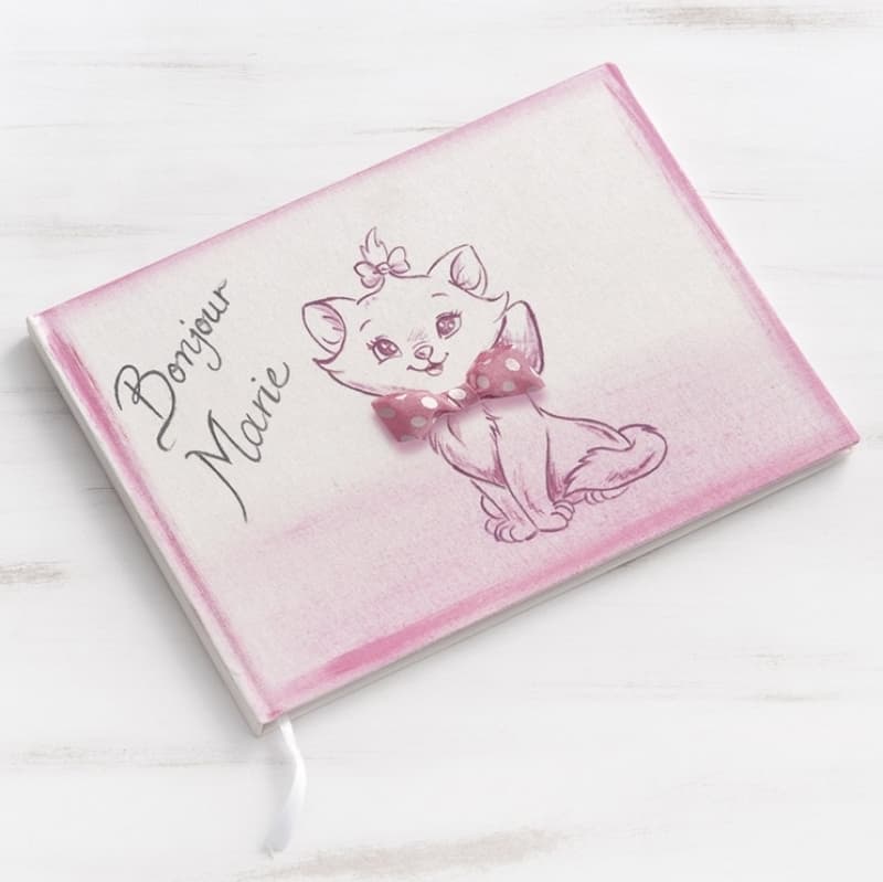 Disney βιβλίο ευχών λευκό με εξώφυλλο από χοντρό χαρτόνι, ζωγραφισμένο στο χέρι με τη γατούλα Marie σε ροζ αποχρώσεις και ζωγραφισμένη τη φράση Bonjour Marie πάνω.