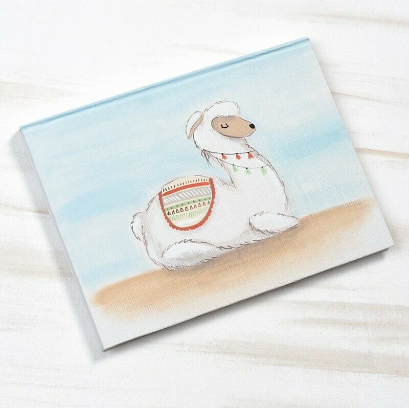 Βιβλίο ευχών λευκό, εξωτερικά από χοντρό χαρτόνι,ζωγραφισμένο στο χέρι με θέμα το λάμα σε λευκές-σιέλ-καφέ αποχρώσεις.