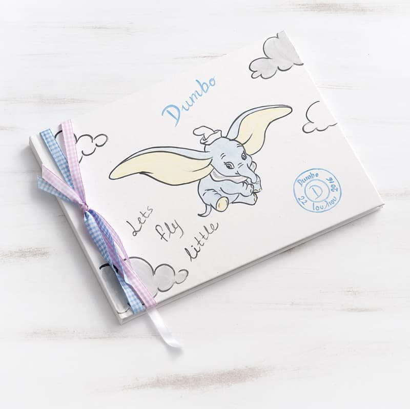 Disney βιβλίο ευχών λευκό με εξώφυλλο από χοντρό χαρτόνι, ζωγραφισμένο στο χέρι με το Dumbo το ελεφαντάκι, σε ροζ-σιέλ-γκρι αποχρώσεις και ζωγραφισμένη τη φράση Let's fly little Dumbo πάνω.