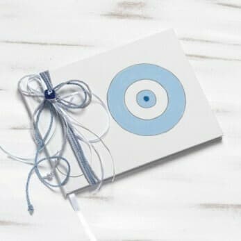 Βιβλίο ευχών λευκό εξωτερικά από χοντρό χαρτόνι ζωγραφισμένο στο χέρι με μάτι σιέλ για καλοτυχία και δεμένο με κορδόνια γκρι-σιέλ και σατέν κορδέλες