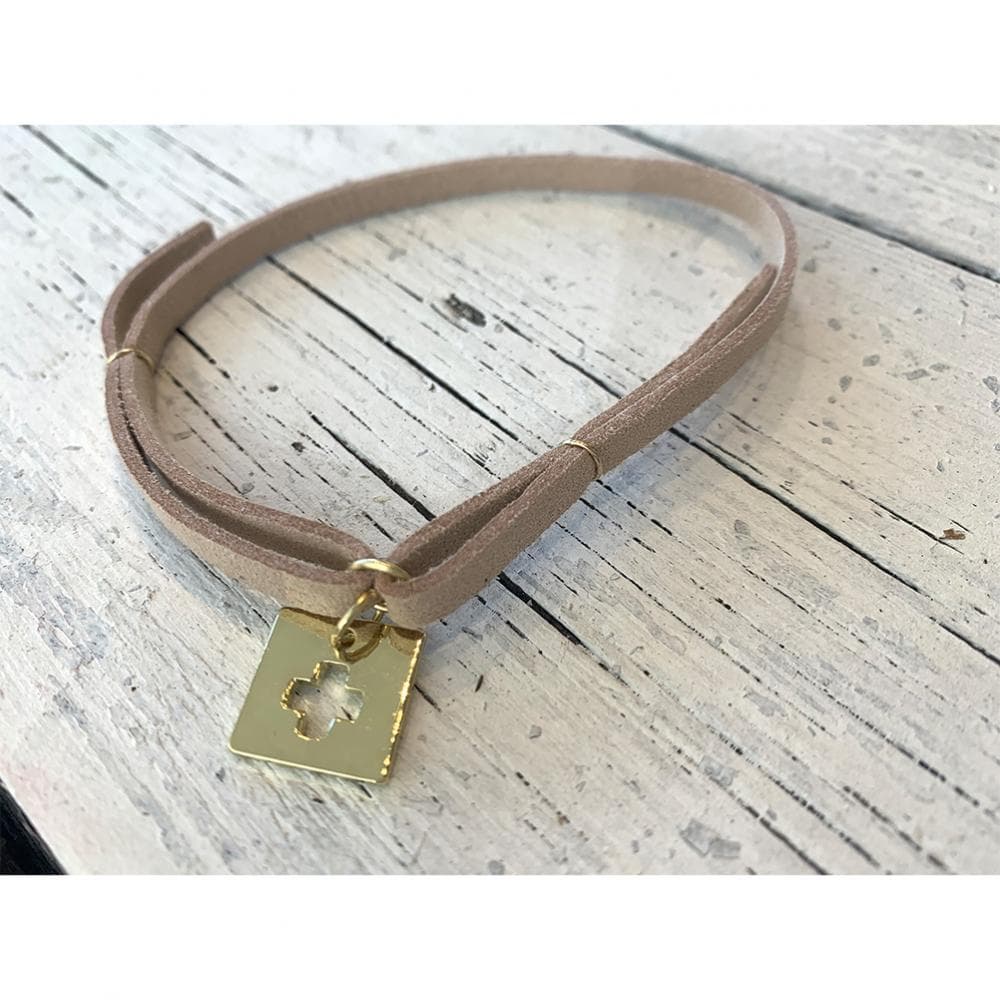 Μαρτυρικό Βάπτισης Βραχιόλι Μπεζ Σουέτ Τετράγωνο με Διάτρητο Χρυσό Σταυρό