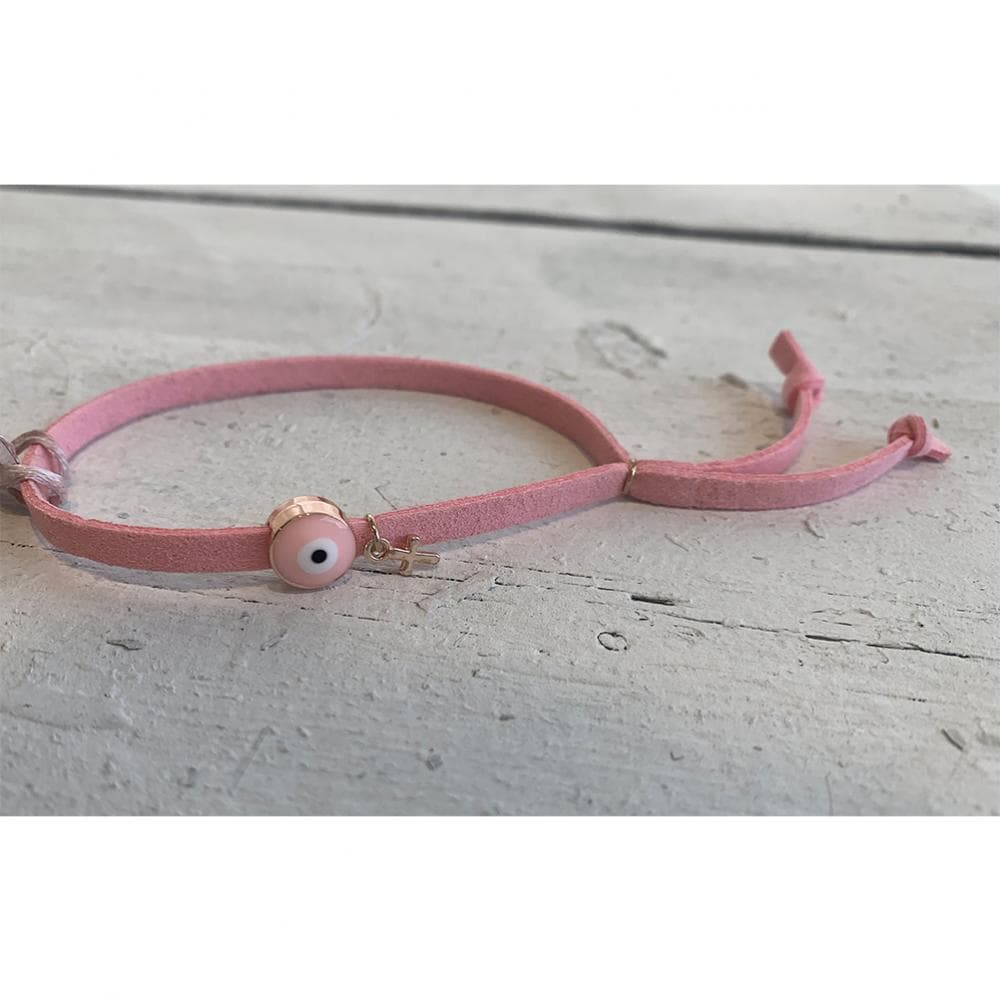 Μαρτυρικό Βάπτισης Βραχιόλι Ροζ Σουέτ με Ματάκι και Σταυρουδάκι