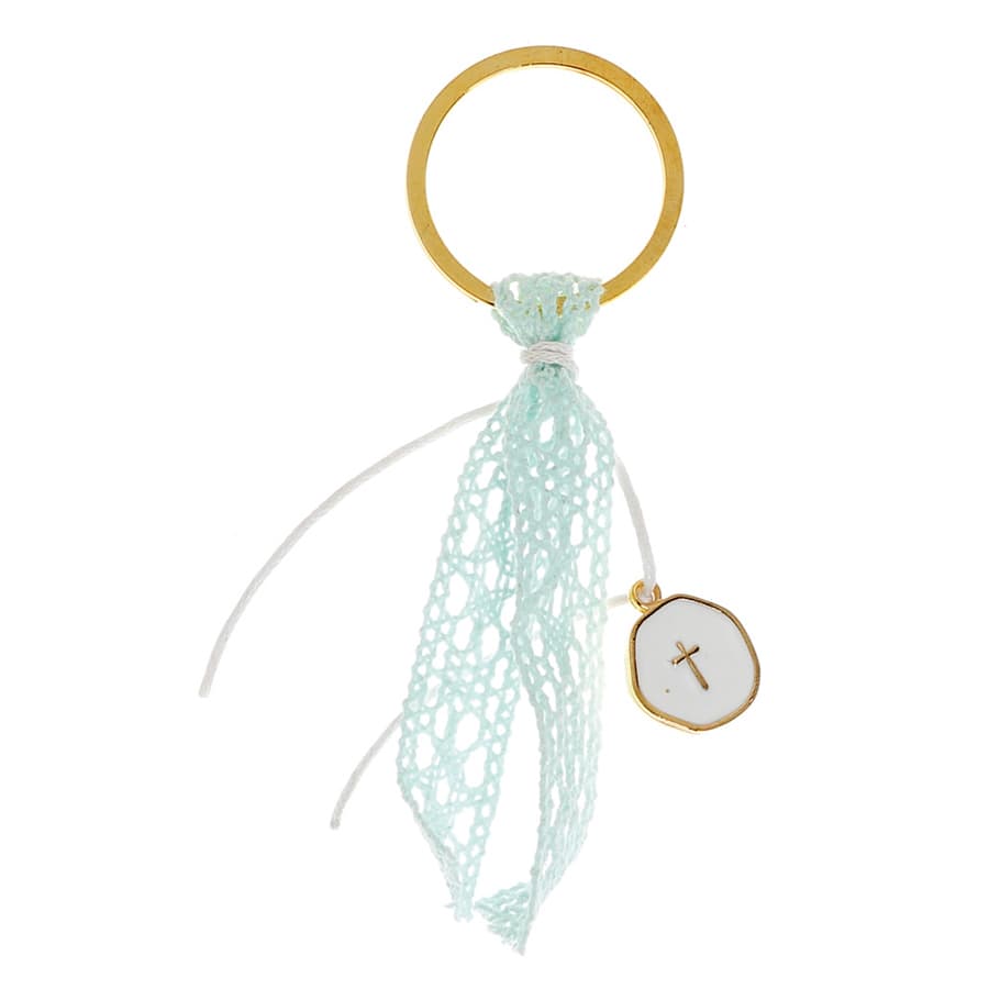 Μαρτυρικά μπρελόκ για τους καλεσμένους σας. Χειροποίητο μαρτυρικό μπρελόκ με λευκό-χρυσό σταυρό και μέντα δαντέλα.
