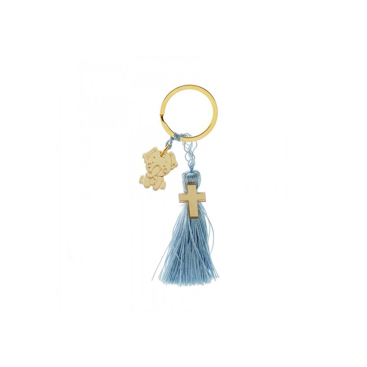 Μαρτυρικά μπρελόκ με χρυσό κρίκο, με θέμα το ελεφαντάκι με γαλάζια φούντα.