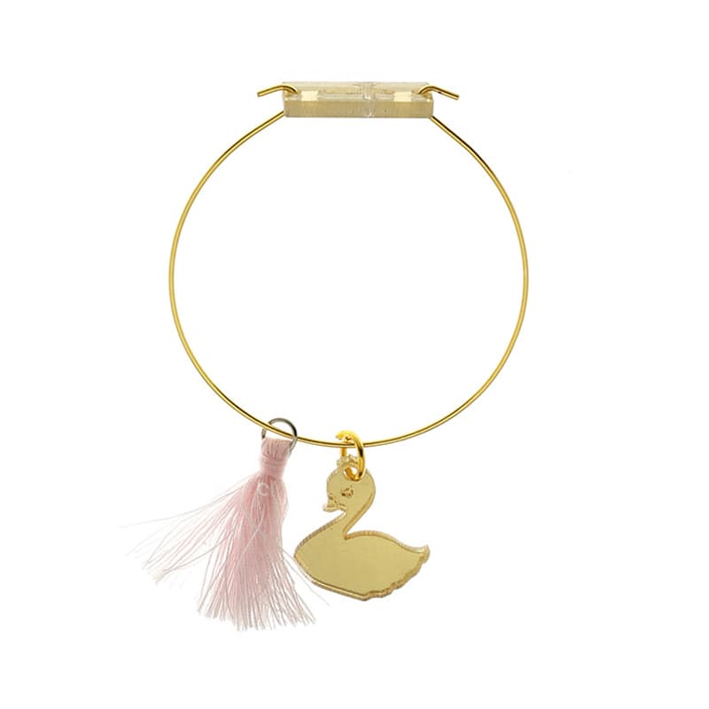 Μαρτυρικά βραχιόλια χρυσή χειροπέδα, με θέμα τον κύκνο με ροζ φούντα.