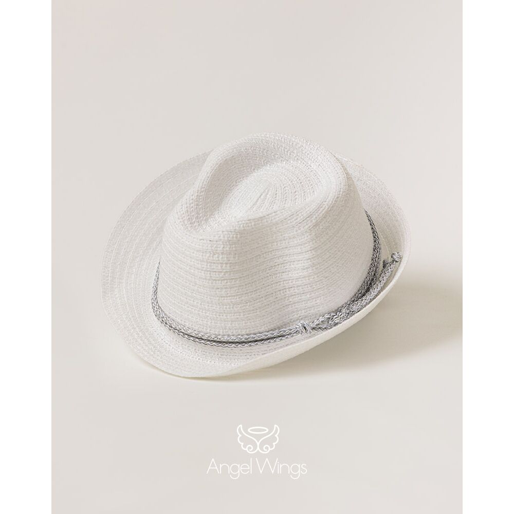 Το όλο σετ συνδυάζεται με ψάθινο καπέλο σε off white χρώμα και φουλάρι εμπριμέ τυπωτό σε καμβά που δημιούργησε η AW αποκλειστικά για αυτό το σύνολο, στις αποχρώσεις σιέλ-γκρι.