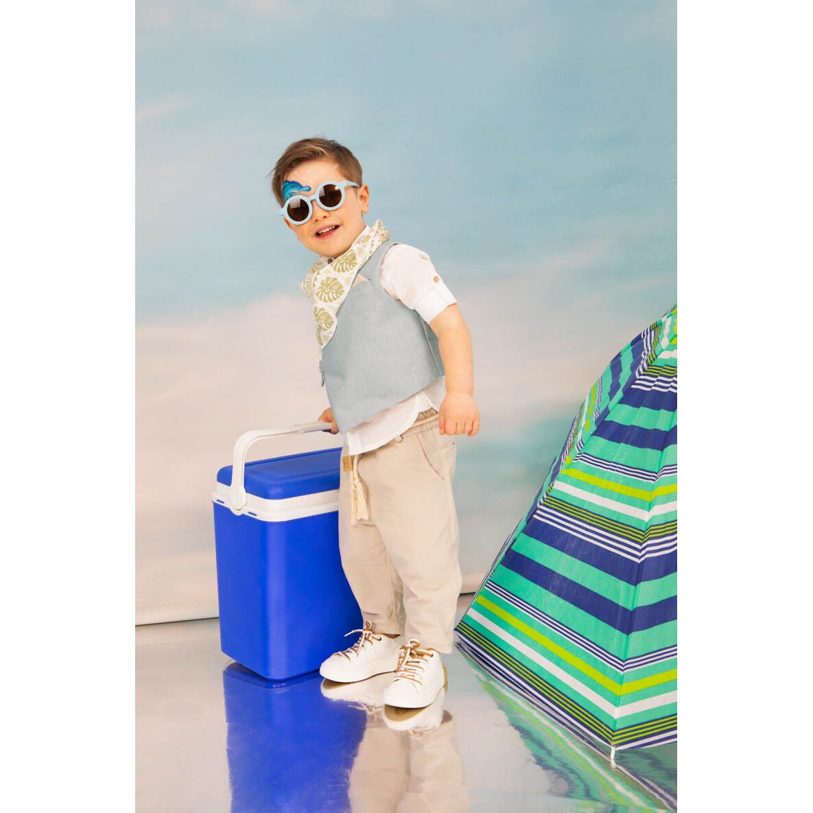 Φουλάρι με φοίνικες στο χρώμα του ρούχου. Καπέλο μελί δίχρωμο καβουράκι με μέντα λεπτομέρεια.