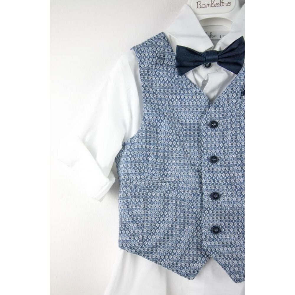 Αποτελείται από ραφ παντελόνι, λευκό πουκάμισο και μπλε γιλέκο.