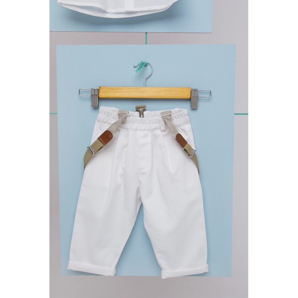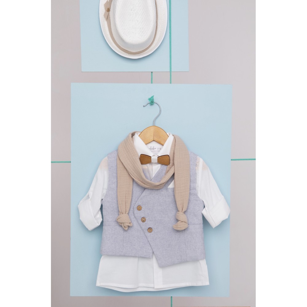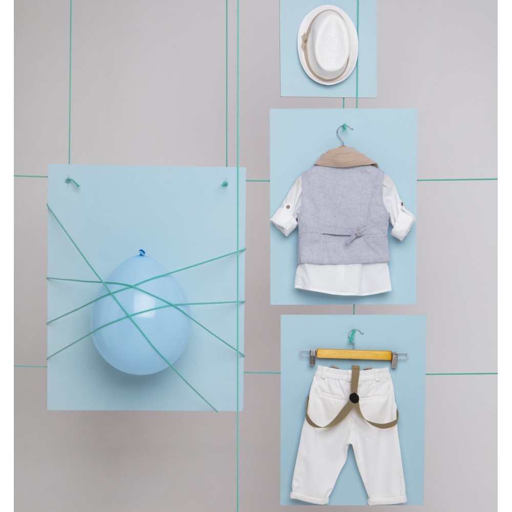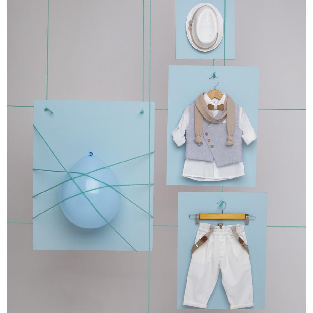 Γιλέκο από σιέλ ψάθα Ιταλίας cotton 100%, πουκάμισο λευκό βαμβακερό 100% με ξύλινο παπιόν και παντελόνι λευκό από alternative καπαρντίνα με μπεζ τιράντες.