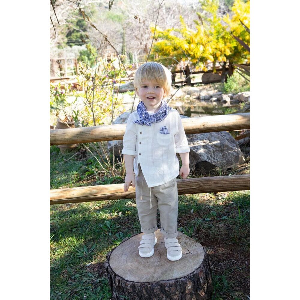 Αποτελείται από cotton παντελόνι και εκρού ιδιαίτερη loose fit πουκαμίσα από γάζα εξαιρετικής ποιότητας.