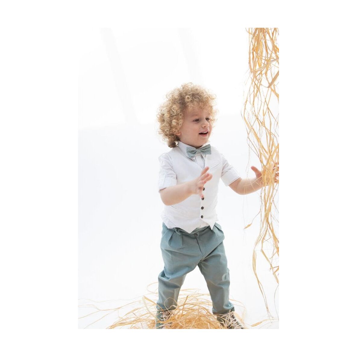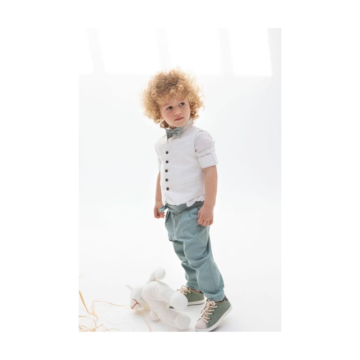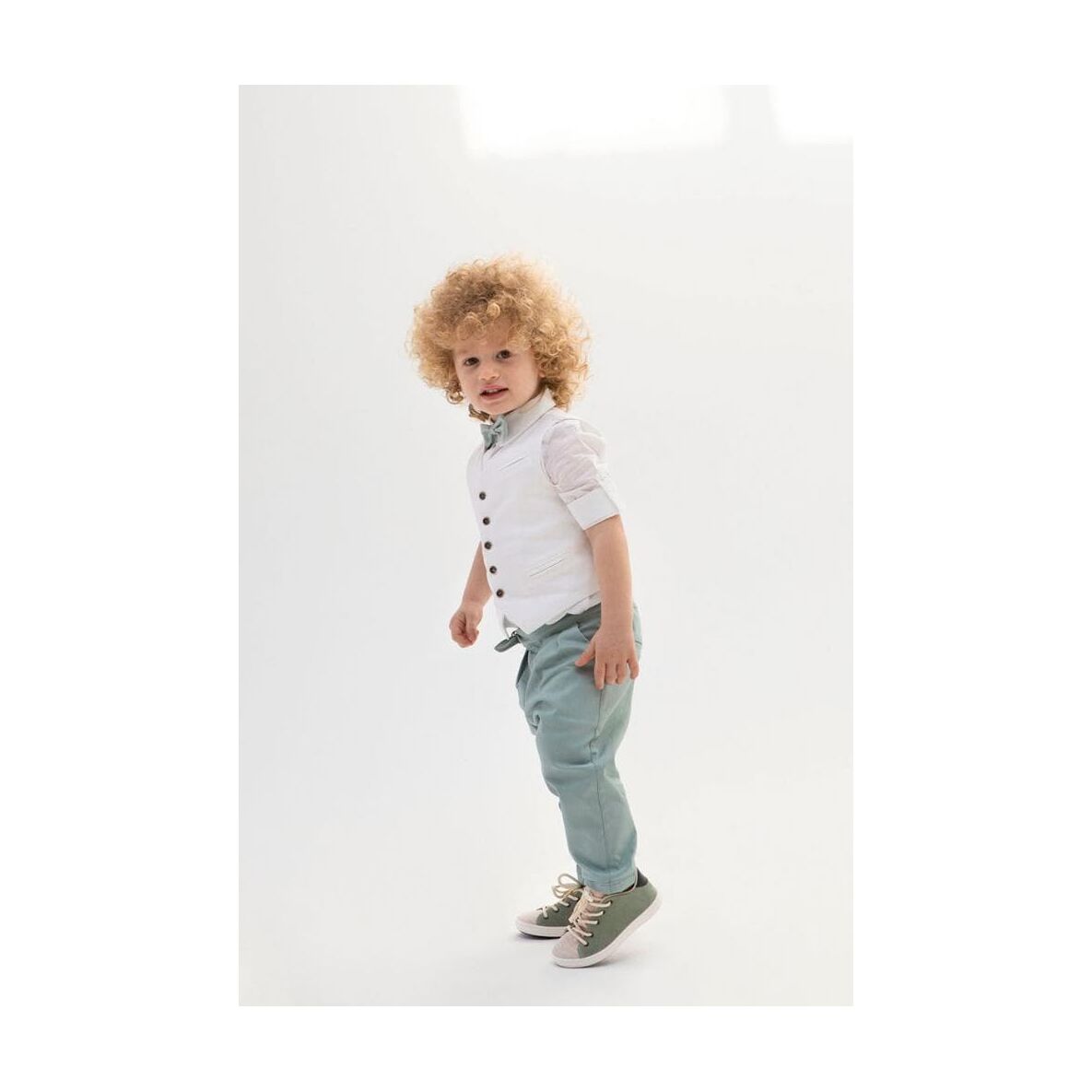 Αποτελείται από εξαιρετικό μέντα παντελόνι, λευκό βαμβακερό πουκάμισο και λευκό λινό γιλέκο.
