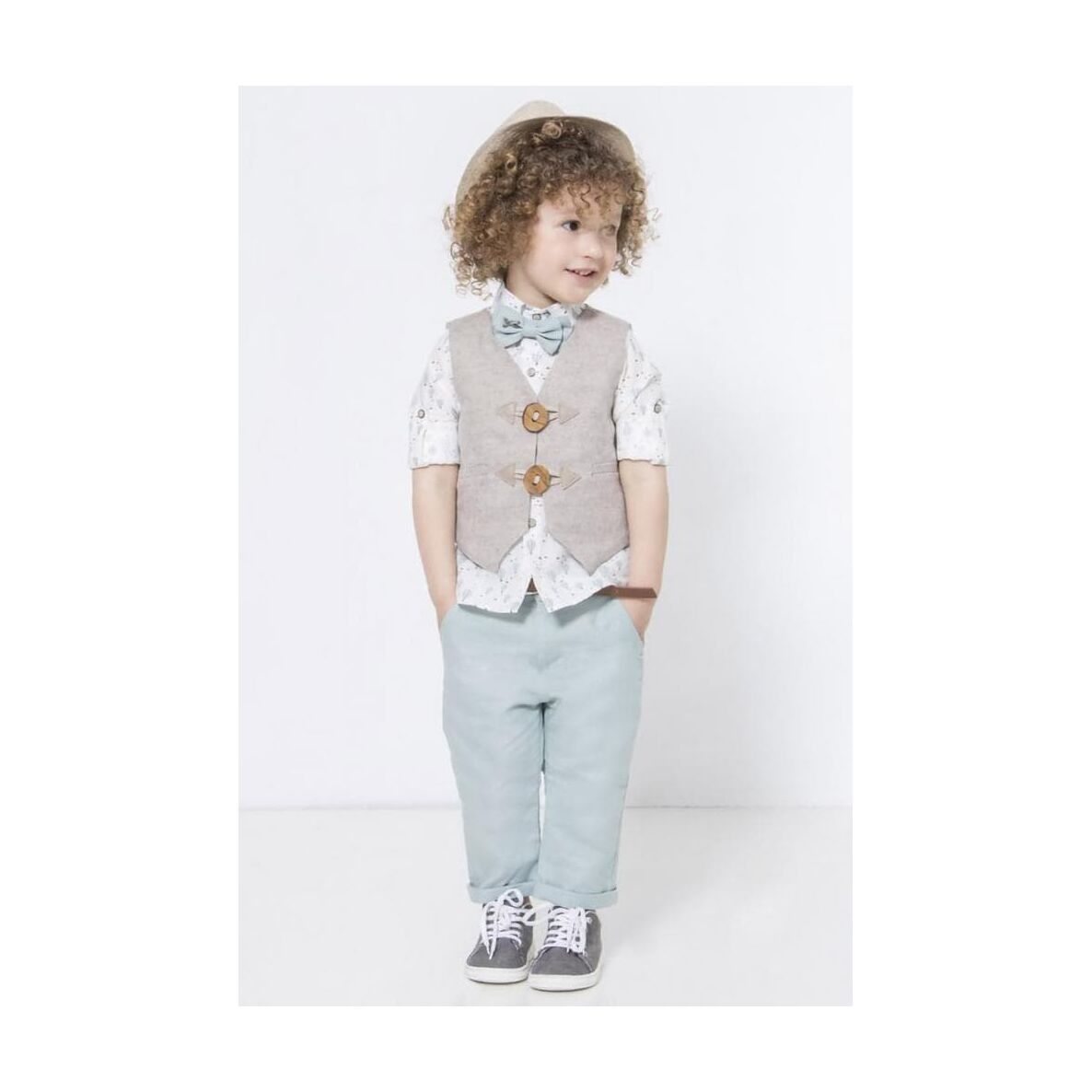 Ρούχο βάπτισης της Bambolino για αγόρια με λευκό πουκάμισο με print αερόστατα, γιλέκο από φυσική ψάθα με ξύλινα κουμπώματα, παπιγιόν, ζώνη, και καπέλο.
