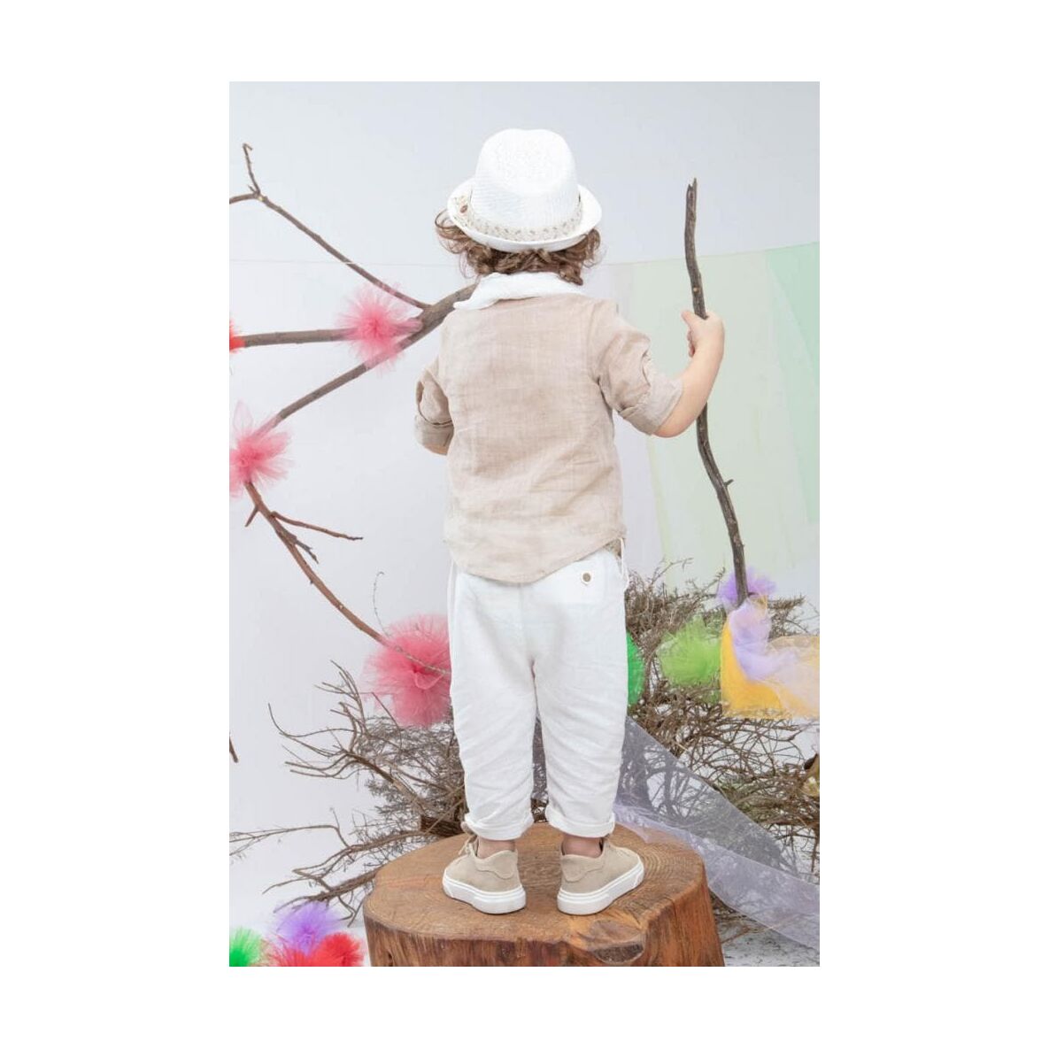 Αποτελείται από λοξό λευκό λινό παντελόνι διακοσμημένο με κουμπιά και μπεζ ramie πουκαμίσα εξαιρετικής ποιότητας.