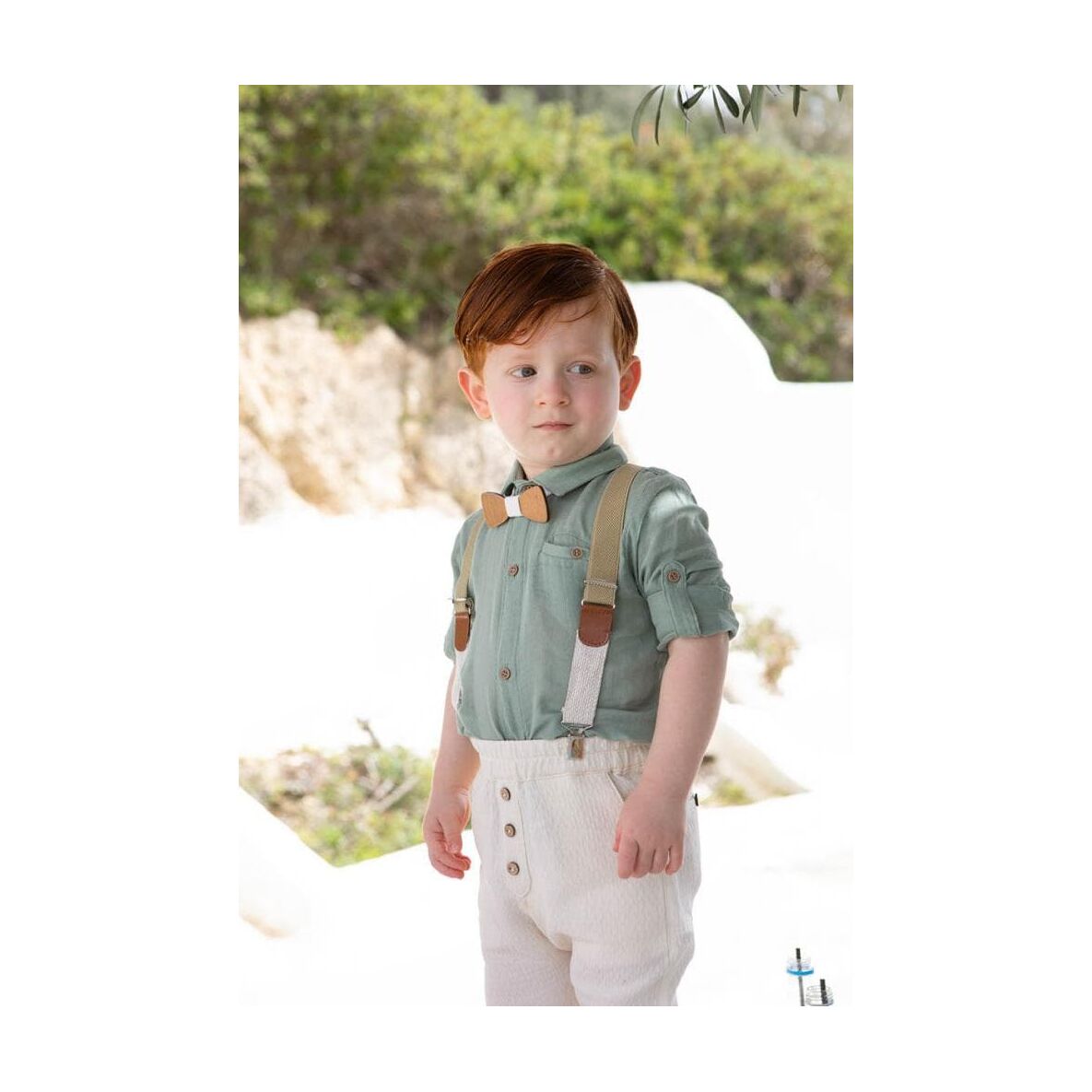 Αποτελείται από μαλακό εκρού παντελόνι το οποίο είναι διακοσμημένο με ξύλινα κουμπιά και από το chic μέντα πουκάμισο.