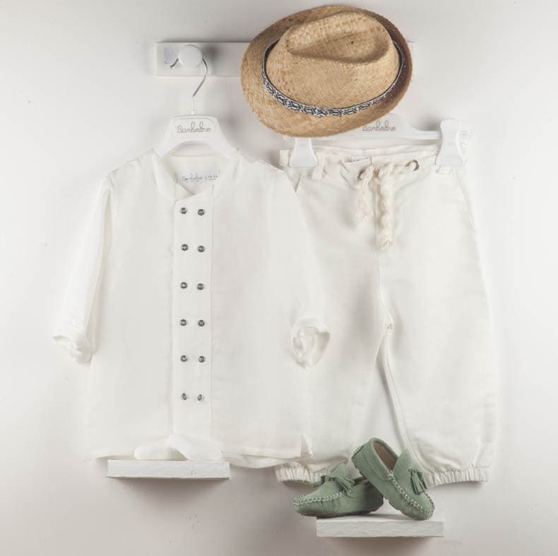 Αποτελείται από εξαιρετικής ποιότητας εκρού λινό πουκάμισο και εκρού λινό παντελόνι με λευκό πουκάμισο.