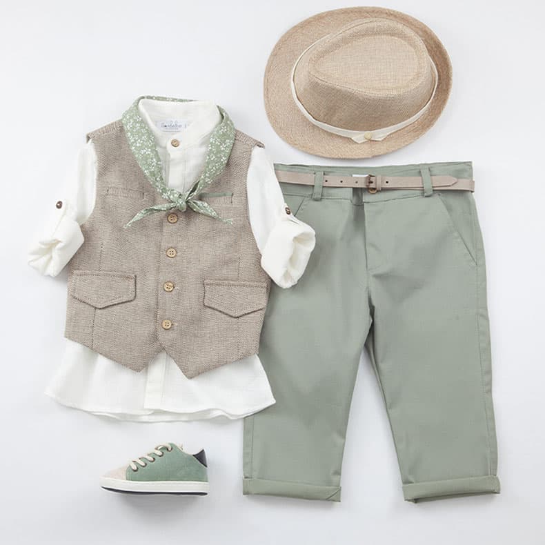 Αποτελείται από λαδί παντελόνι, εκρού οργανική πουκαμίσα και κλασικό μπεζ γιλέκο.