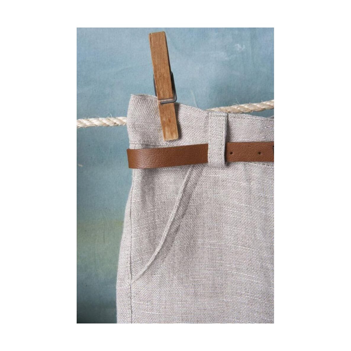 Το σύνολο περιλαμβάνει λινό μπεζ παντελονάκι, βαμβακερό λευκό πουκάμισο, γιλέκο στο χρώμα της μέντας με ξύλινα κουμπιά, υφασμάτινο παπιγιόν και λευκό καπέλο.