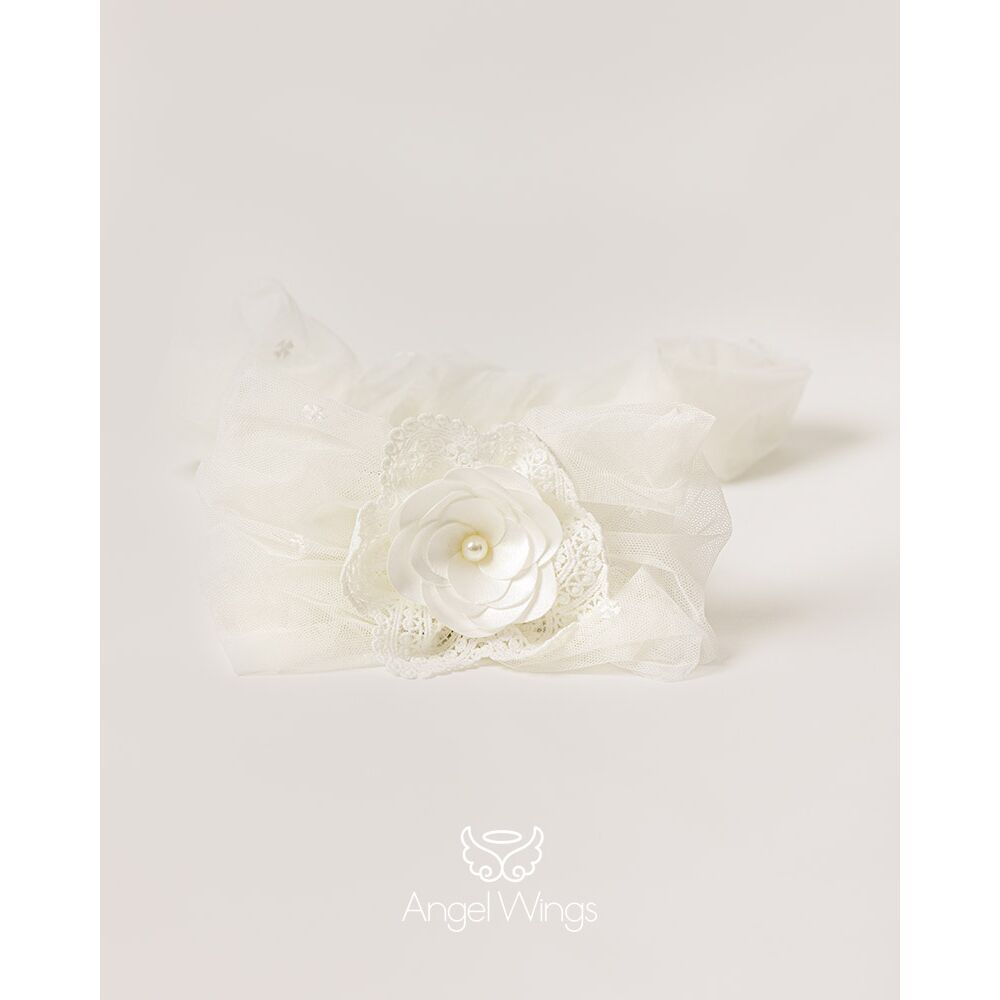 Το σύνολο ολοκληρώνεται με την κορδέλα μαλλιών από τούλι και εντυπωσιακό χειροποίητο φιόγκο με λουλούδι.