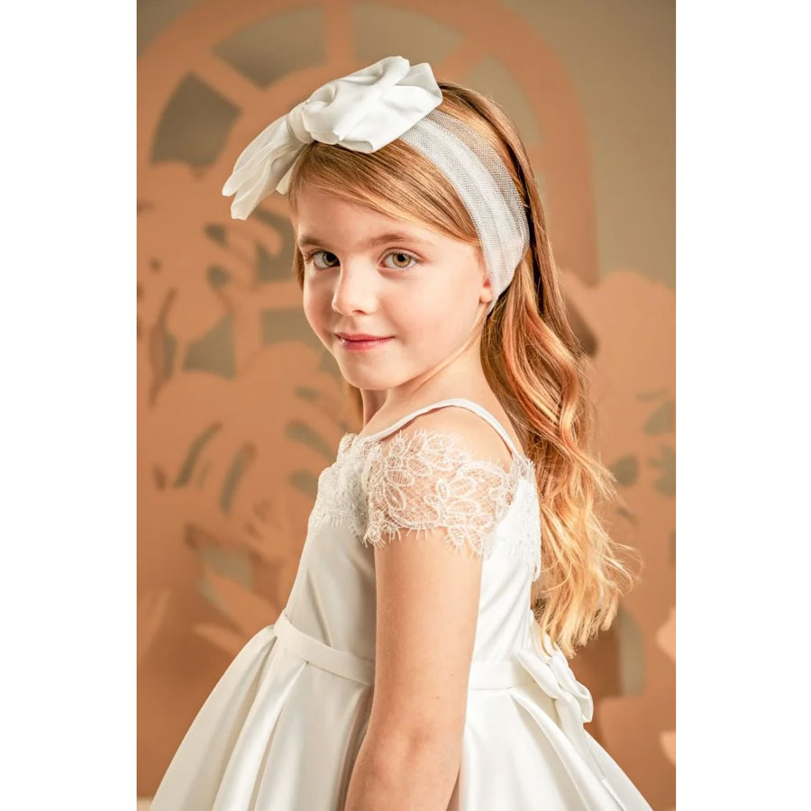 Το σύνολο ολοκληρώνεται με μια σατέν ζώνη που αγκαλιάζει τη μέση και καταλήγει πίσω σε διπλό φιόγκο, καθώς και με την τούλινη κορδέλα για τα μαλλιά, διακοσμημένη με τον ίδιο σατέν φιόγκο της ζώνης.