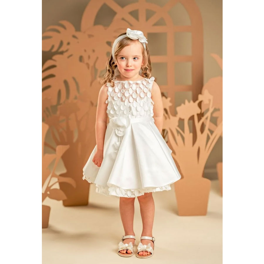 Στη μέση, η σατέν ζώνη με το χειροποίητο λουλούδι και τον διπλό φιόγκο στο πίσω μέρος, καθώς και η κορδέλα για τα μαλλιά από τούλι, διακοσμημένη επίσης με το ίδιο λουλούδι του φορέματος, ολοκληρώνουν άψογα το σύνολο.