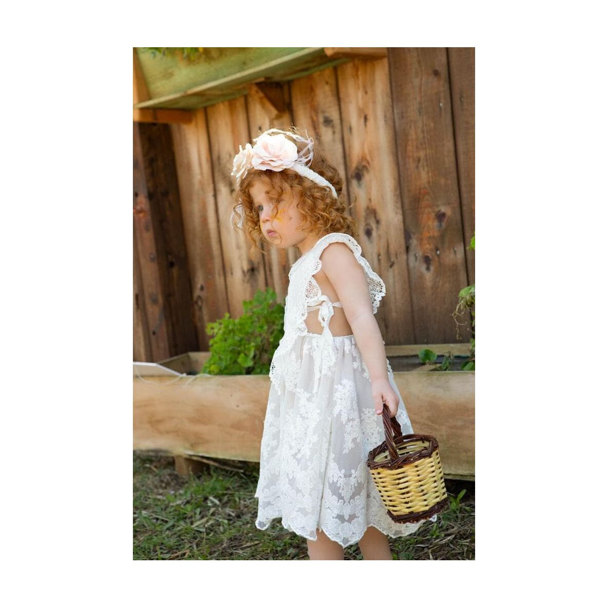 Το ρούχο το συνοδεύει κορδέλα με φτερά και handmade dusty pink λουλούδι.