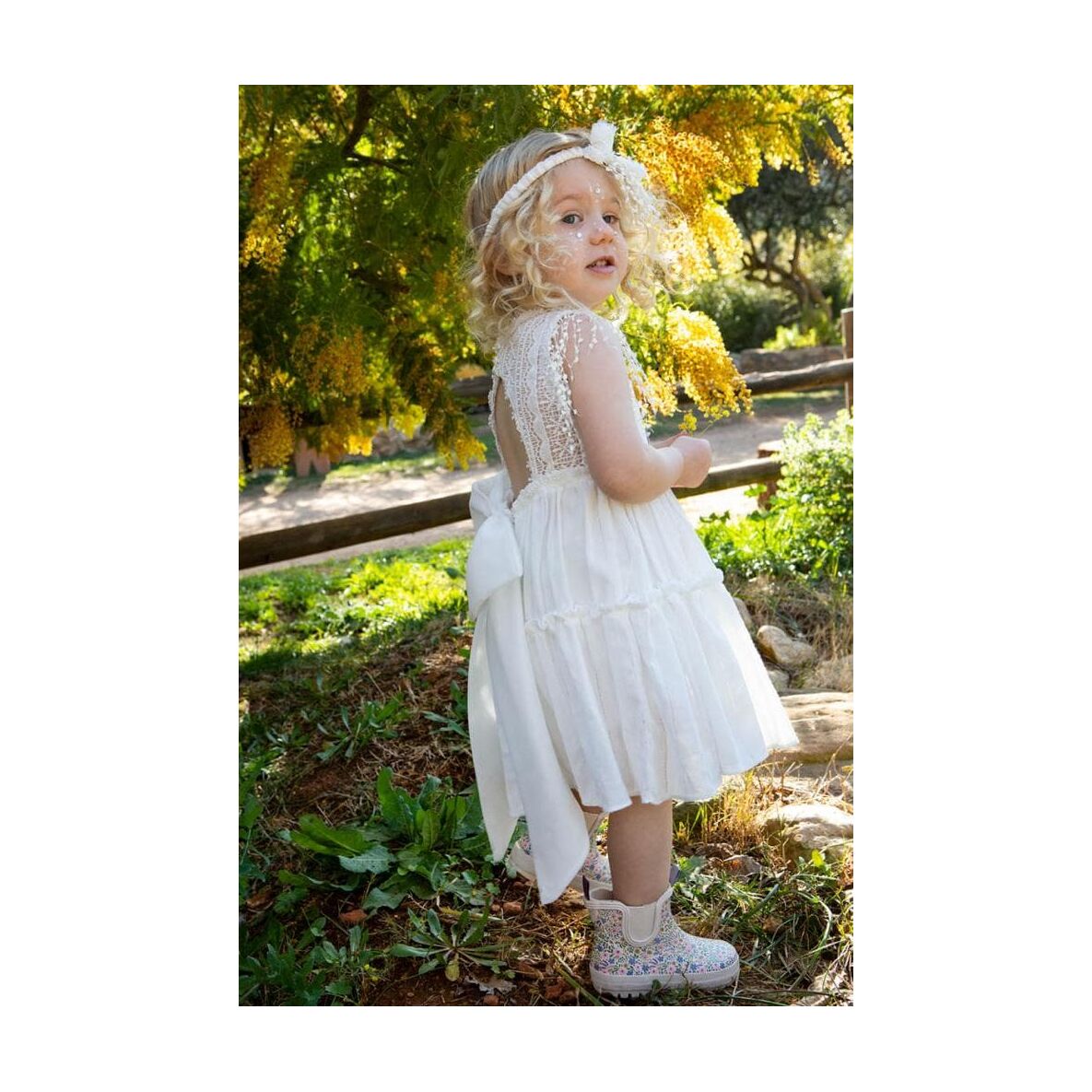 Το αξεσουάρ για το κεφάλι είναι η κορδέλα με χειροποίητα εκρού δαντελένια λουλούδια.