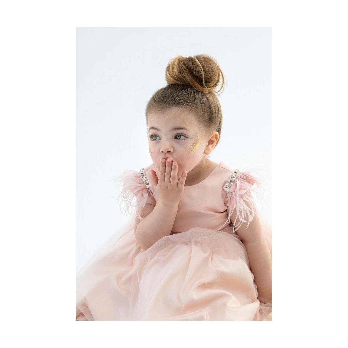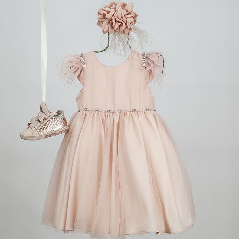 Διακοσμημένο με φτερά, πούπουλα και κρύσταλλα Swarovski στα petit μανίκια του ρούχου που του δίνουν μια ρομαντική διάθεση.