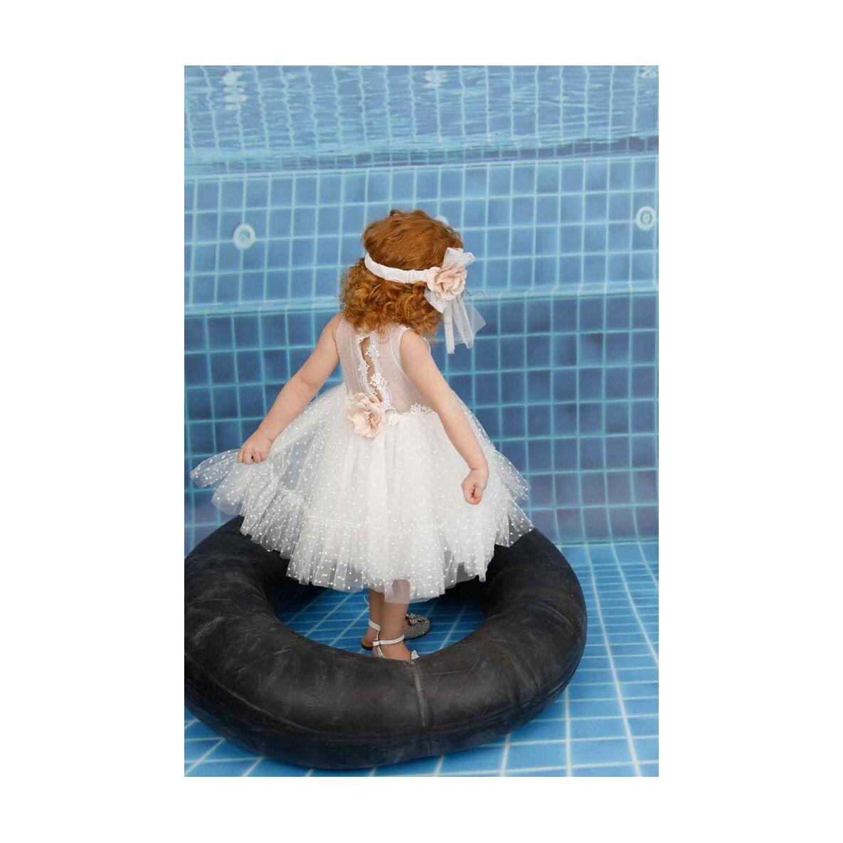 Η Olivia είναι ενα εκρού βαπτιστικό φόρεμα με πουά ανάγλυφο τούλι.
