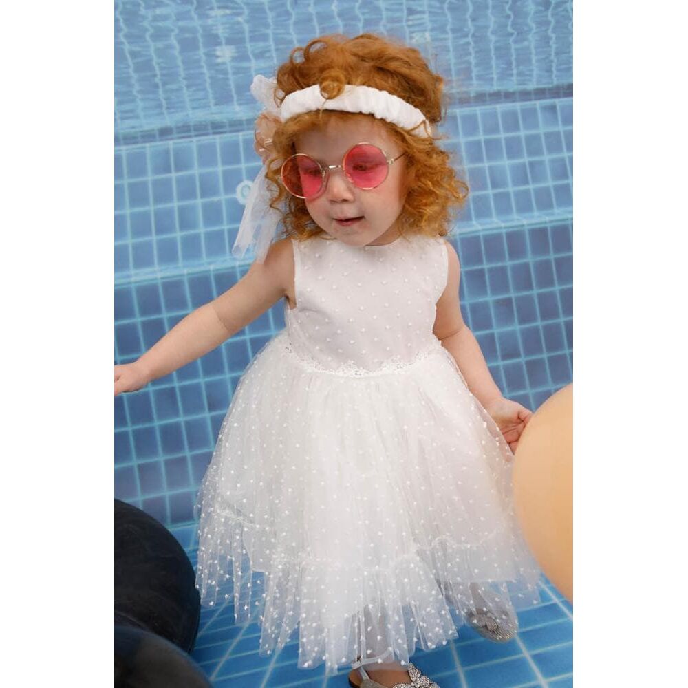 Η Olivia είναι ενα εκρού βαπτιστικό φόρεμα με πουά ανάγλυφο τούλι.