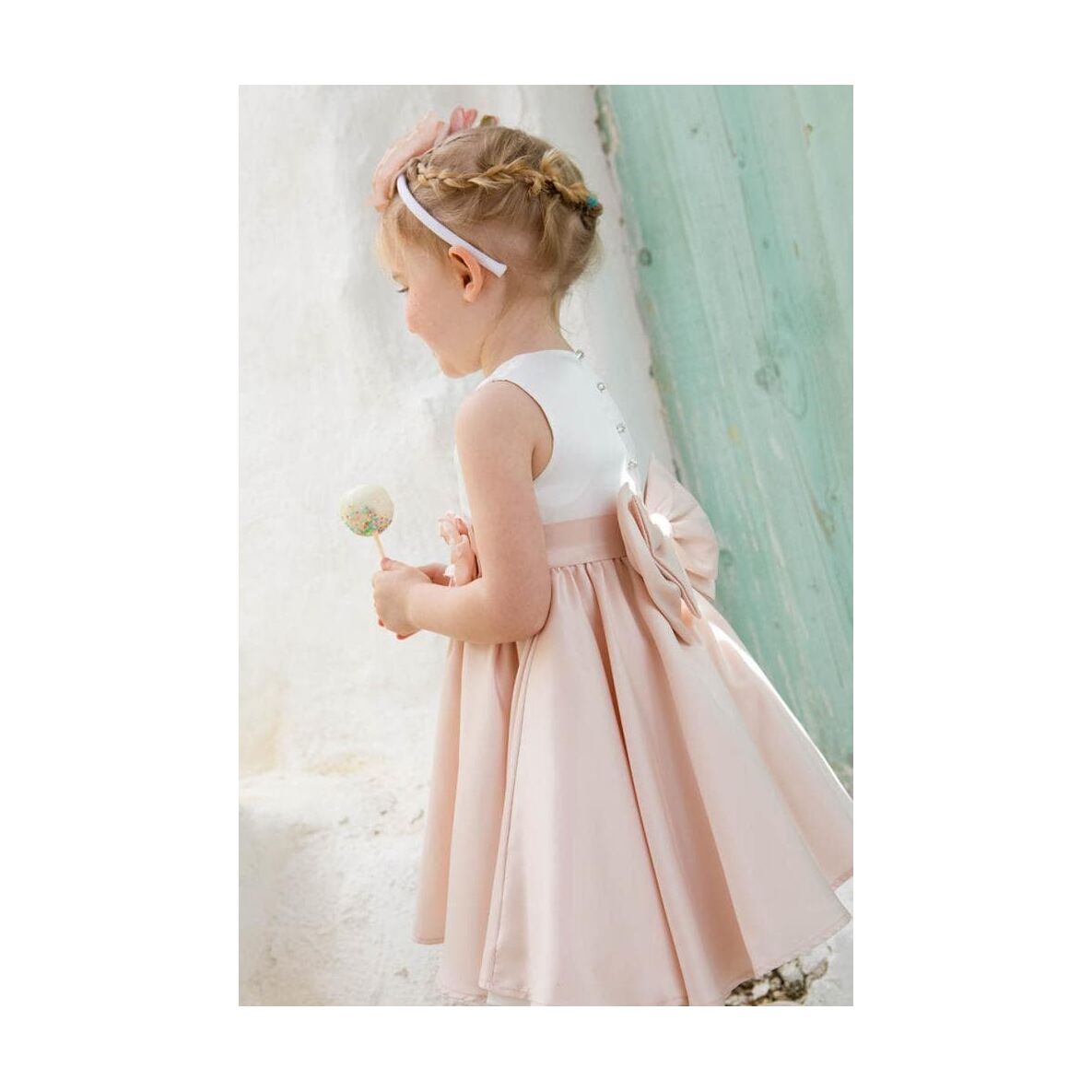 Η Rosa είναι ένα διχρωμο σατέν βαπτιστικο φόρεμα με ενα τεραστιο old-pink φιογκο στο πισω μερος και ενα μεγαλο χειροποιητο λουλουδι στο μπροστινο μερος της ζωνης.