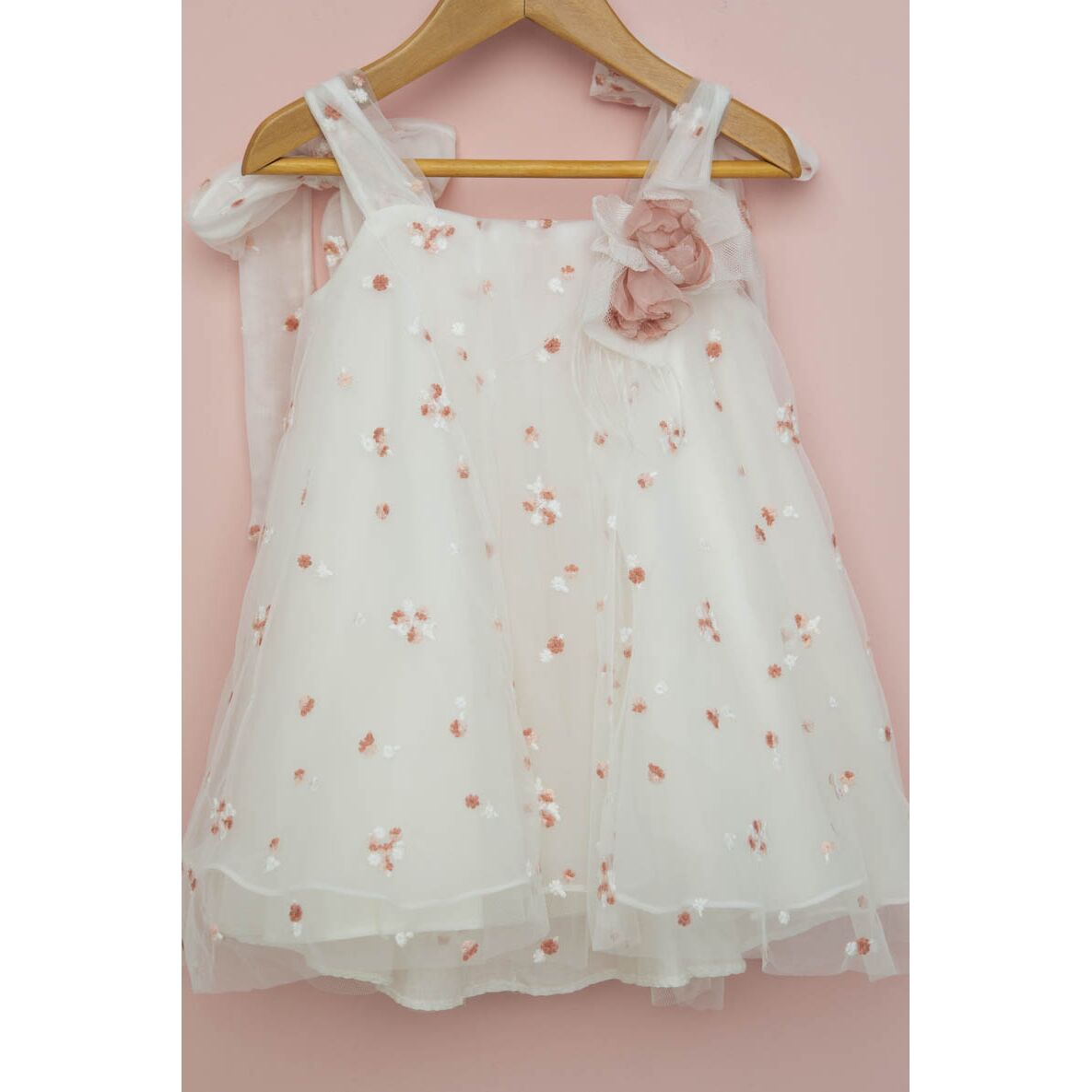 Φόρεμα σε alfa γραμμή από κεντημένη εκρού οργάντζα με μικρά λουλούδια σε χρώμα εκρού, ροζ και old pink.
