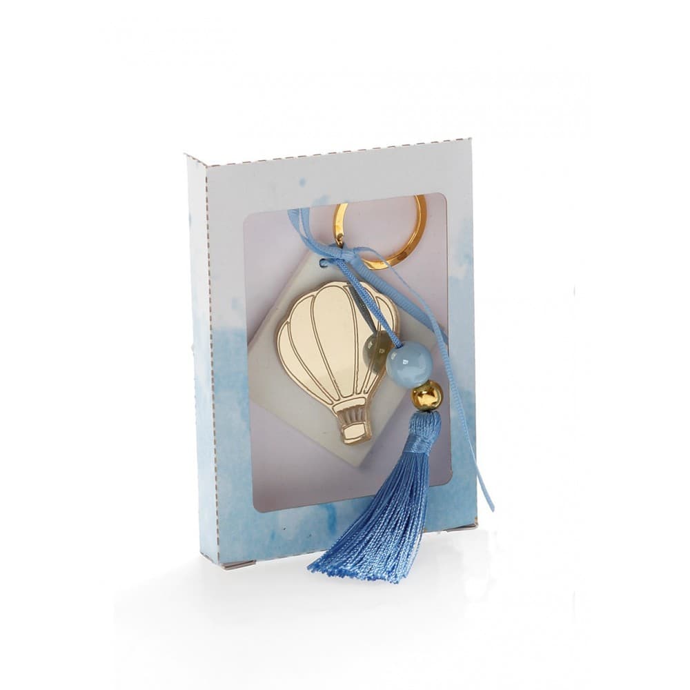 Μπομπονιέρα σε χάρτινο κουτάκι ροζ με αρωματική βάση ρόμβος και χρυσό πλέξιγκλας με σχέδιο αερόστατο.