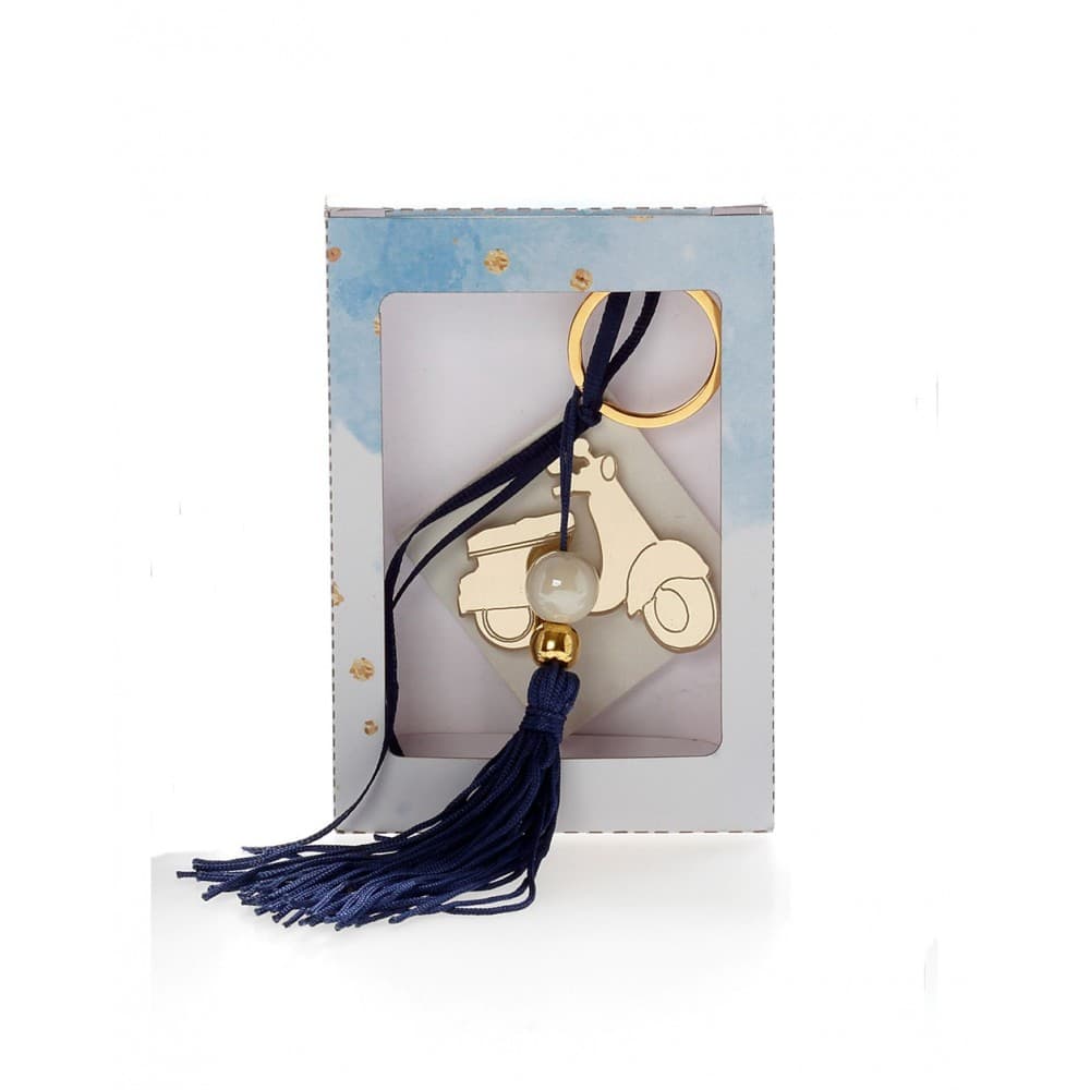 Μπομπονιέρα σε χάρτινο κουτάκι ροζ με αρωματική βάση ρόμβος και χρυσό πλέξιγκλας με σχέδιο βέσπα.