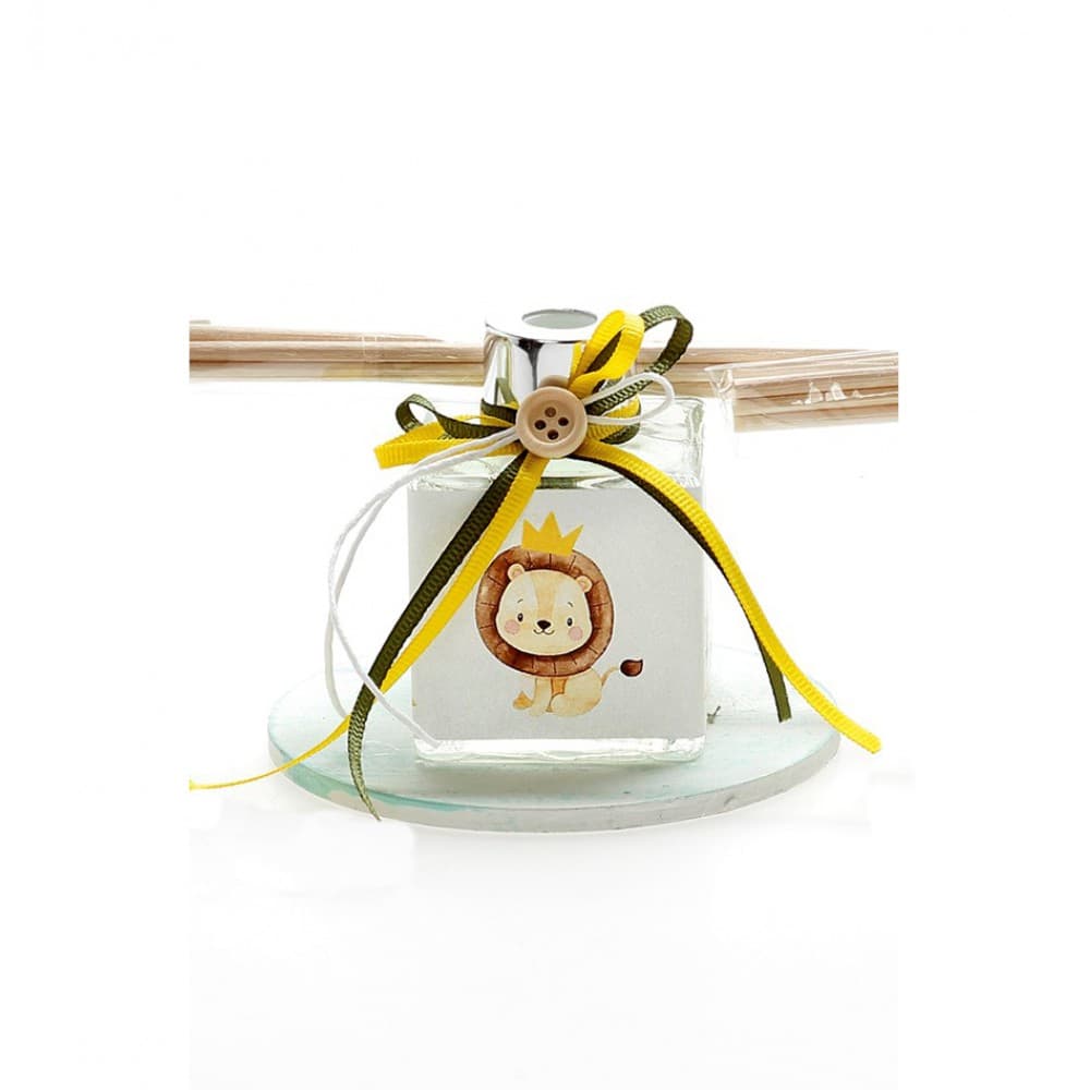 Μπομπονιέρα βάπτισης αρωματικό χώρου 50ml σε ξύλινη βάση με θέμα το λιονταράκι 8Χ10.