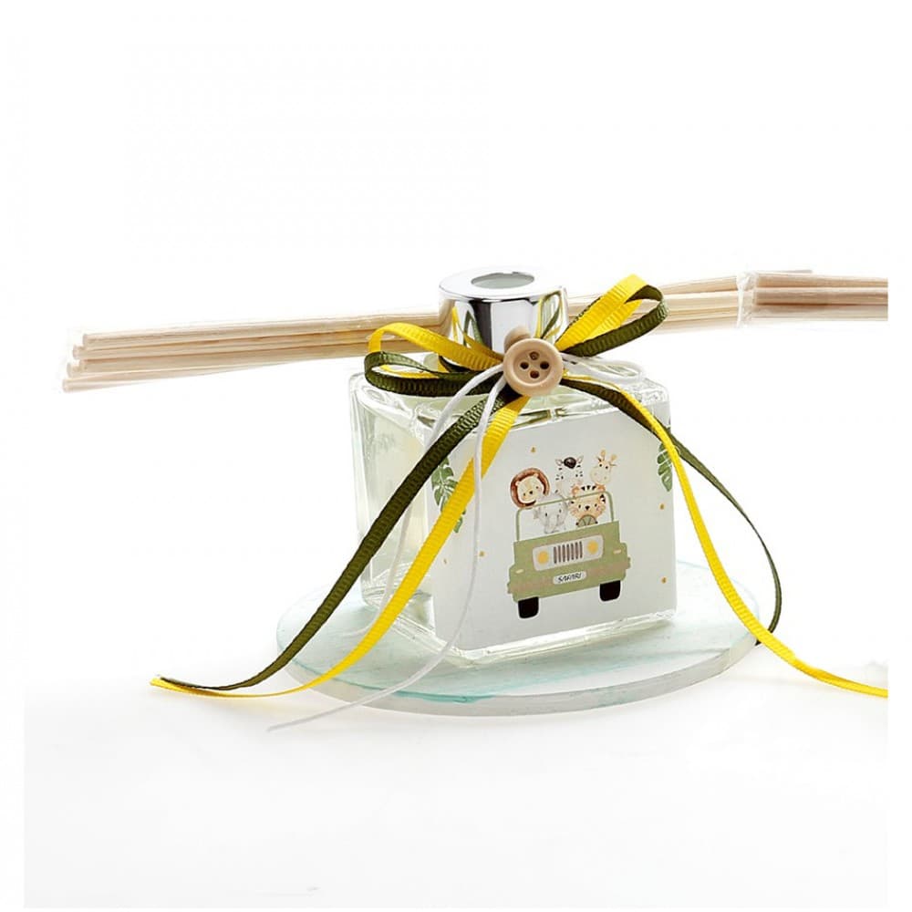Μπομπονιέρα βάπτισης αρωματικό χώρου 50ml σε ξύλινη βάση με θέμα ζωάκια σαφάρι 8Χ10.