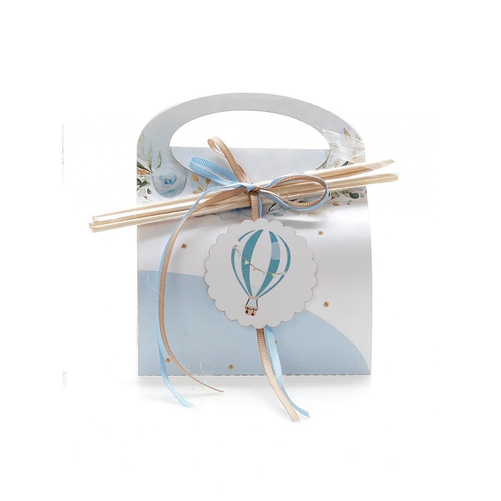 Μπομπονιέρα βάπτισης αρωματικό χώρου 50ml μέσα σε χάρτινο τσαντάκι με θέμα αερόστατο.
