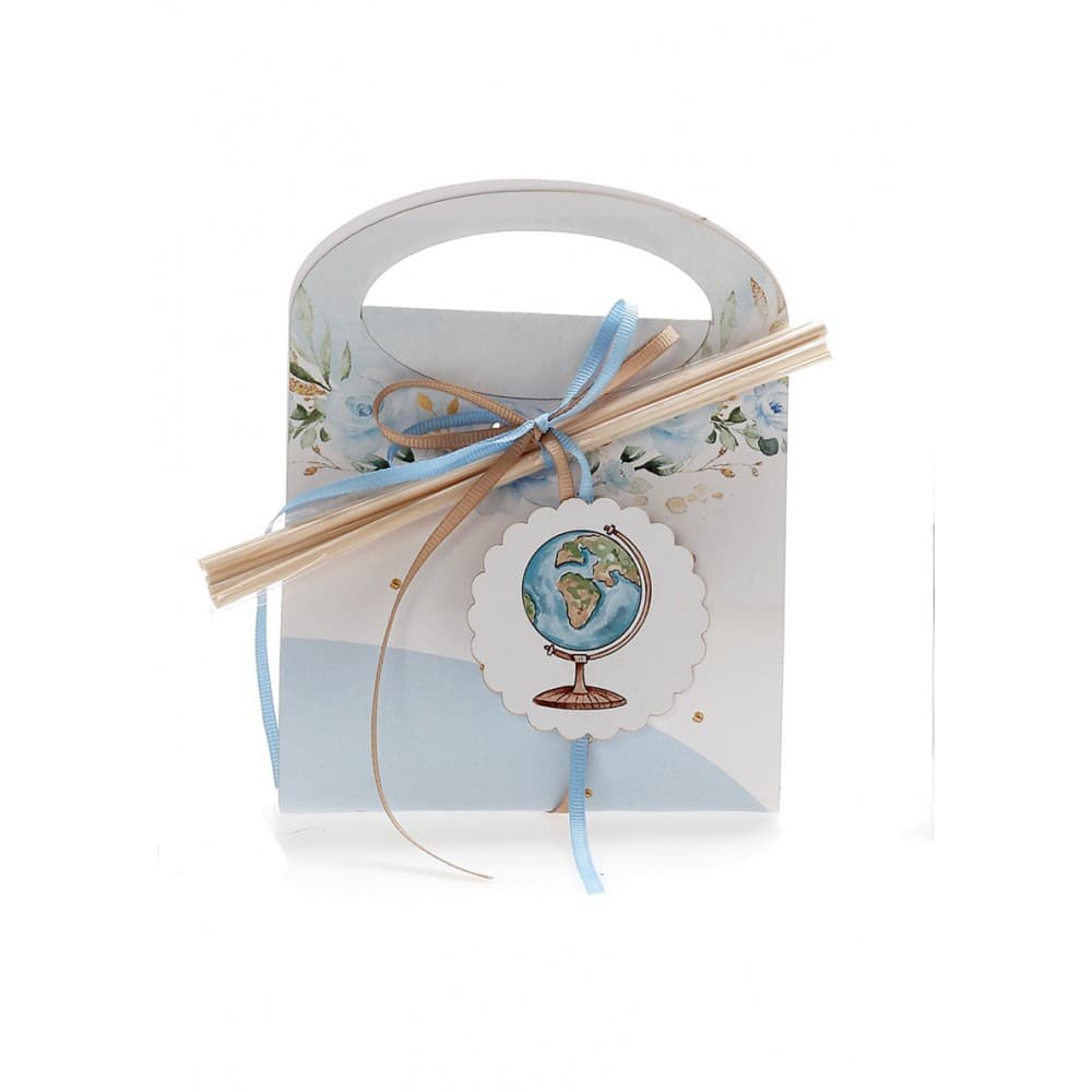 Μπομπονιέρα βάπτισης αρωματικό χώρου 50ml μέσα σε χάρτινο τσαντάκι με θέμα υδρόγειος.