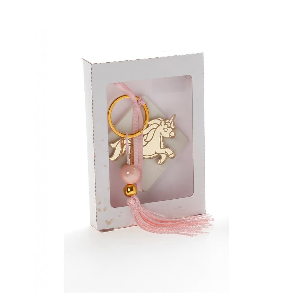 Μπομπονιέρα σε χάρτινο κουτάκι ροζ με αρωματική βάση ρόμβος και χρυσό πλέξιγκλας με σχέδιο μονόκερος.