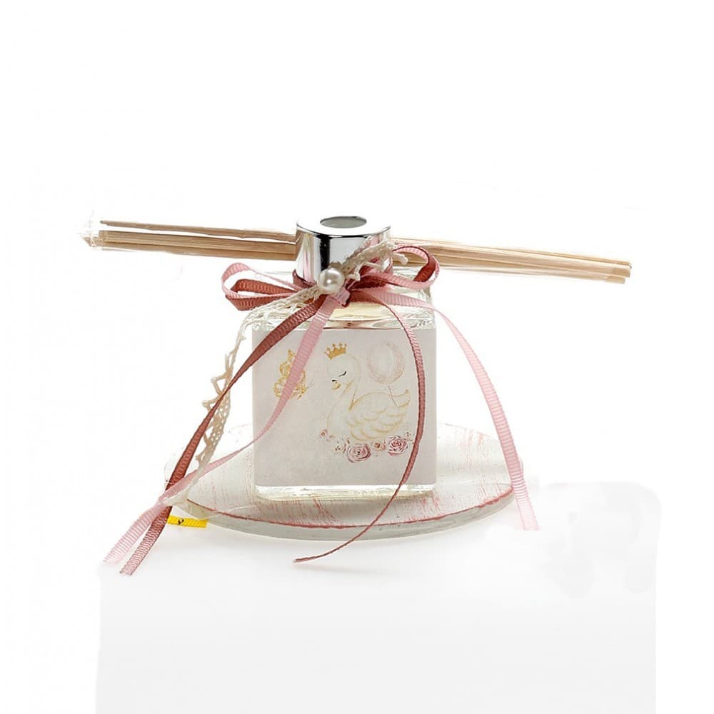 Μπομπονιέρα βάπτισης αρωματικό χώρου 50ml σε ξύλινη βάση με θέμα κύκνος 8Χ10.