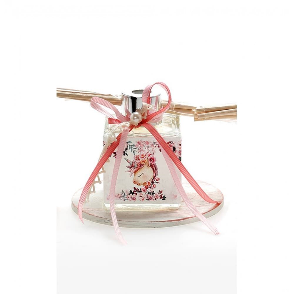 Μπομπονιέρα βάπτισης αρωματικό χώρου 50ml σε ξύλινη βάση με θέμα μονόκερος 8Χ10.