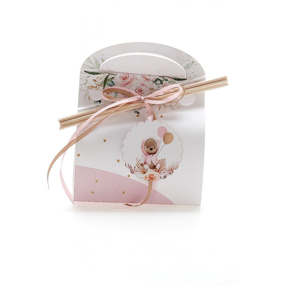 Μπομπονιέρα βάπτισης αρωματικό χώρου 50ml μέσα σε χάρτινο τσαντάκι με θέμα Αρκουδάκι.
