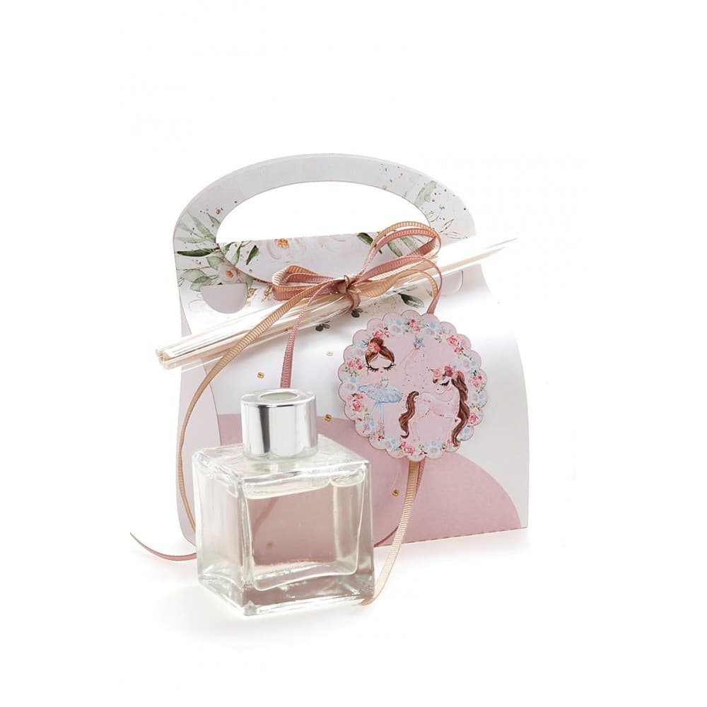 Μπομπονιέρα βάπτισης αρωματικό χώρου 50ml μέσα σε χάρτινο τσαντάκι με θέμα μπαλαρίνα.