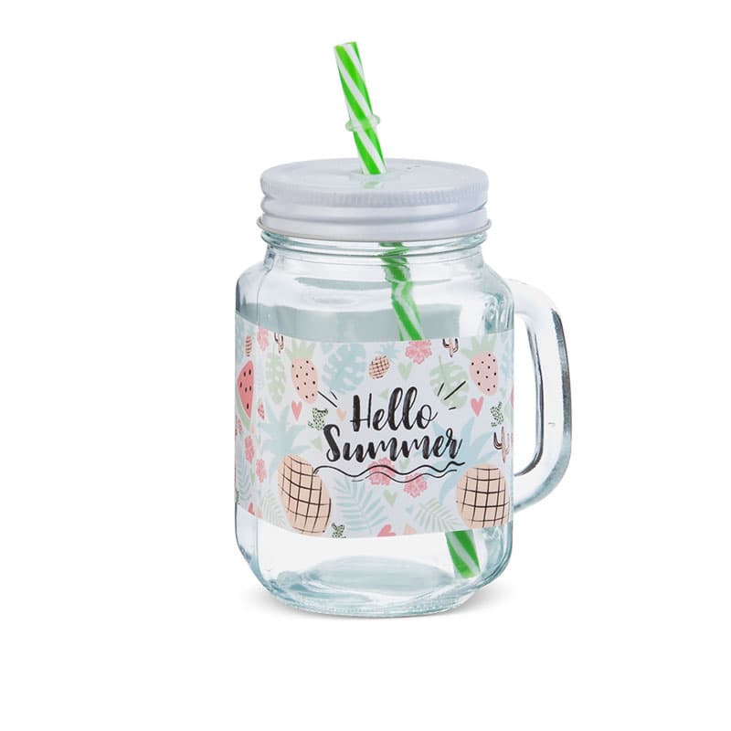 Γυάλινη διάφανη κούπα με λευκό καπάκι και αυτοκόλλητο Hello Summer με περιεκτικότητα: 300ml. Συνοδεύεται από πολύχρωμα καλαμάκια.
