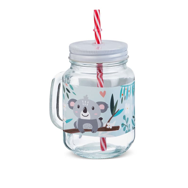 Γυάλινη διάφανη κούπα με λευκό καπάκι και αυτοκόλλητο Koala. Περιεκτικότητα: 300ml. Συνοδεύεται από πολύχρωμα καλαμάκια.