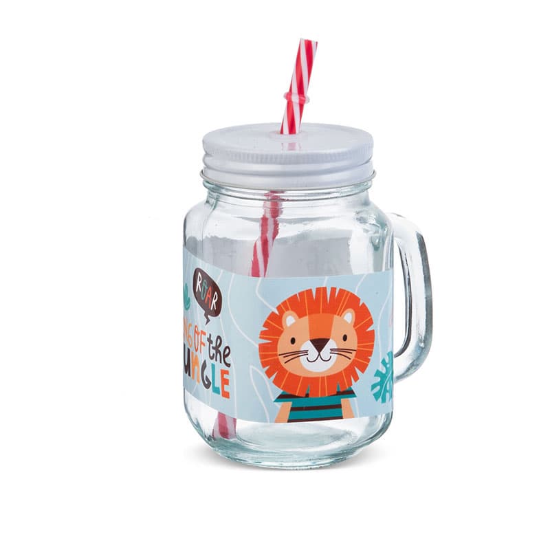 Γυάλινη διάφανη κούπα με λευκό καπάκι και αυτοκόλλητο Λιοντάρι. Περιεκτικότητα: 300ml. Συνοδεύεται από πολύχρωμα καλαμάκια.