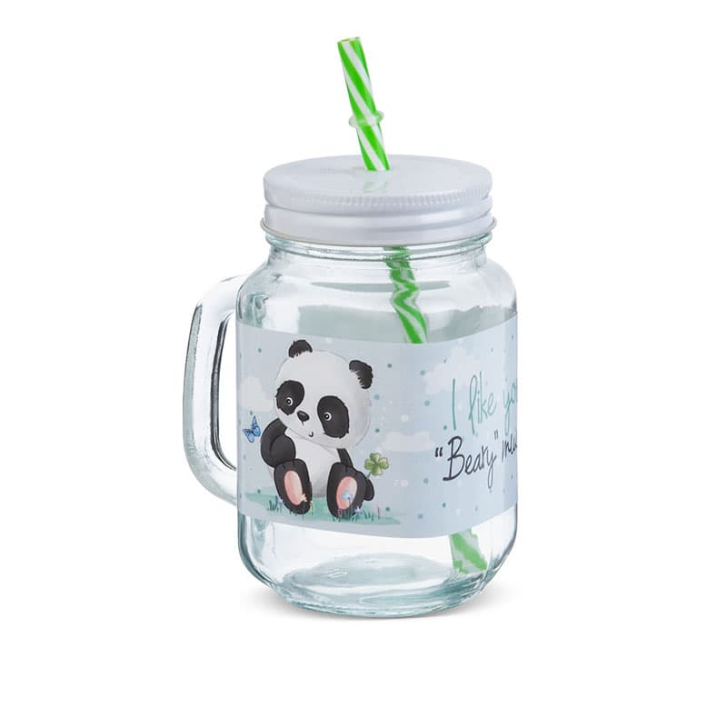 Γυάλινη διάφανη κούπα με λευκό καπάκι και αυτοκόλλητο Panda. Περιεκτικότητα: 300ml. Συνοδεύεται από πολύχρωμα καλαμάκια.