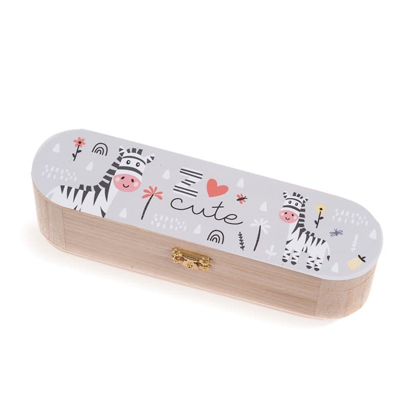 Ξύλινη natural κασετίνα με μεταλλικό κούμπωμα. Είναι διακοσμημένη με αυτοκόλλητο print Ζέβρα.