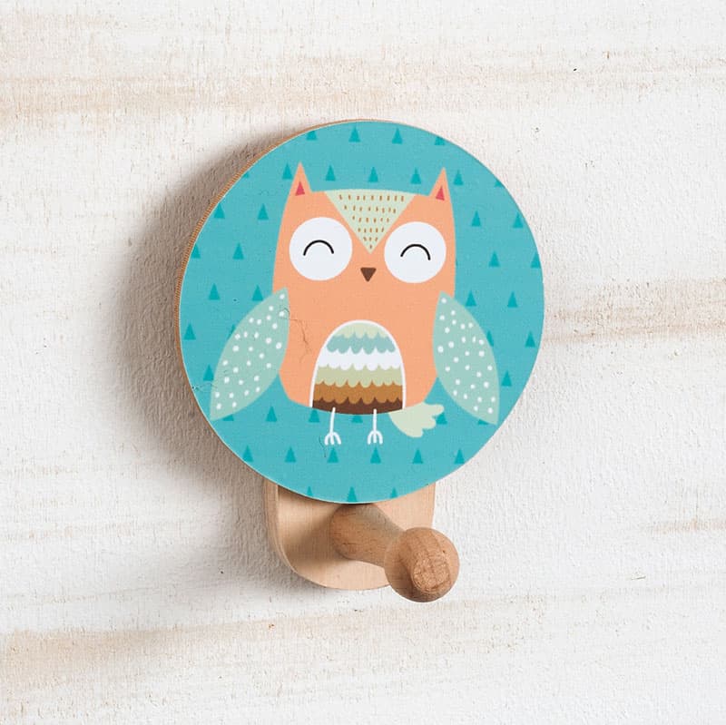 Ξύλινη natural κρεμάστρα τοίχου, διακοσμημένη με στρογγυλό κοπτικό Κουκουβάγια.