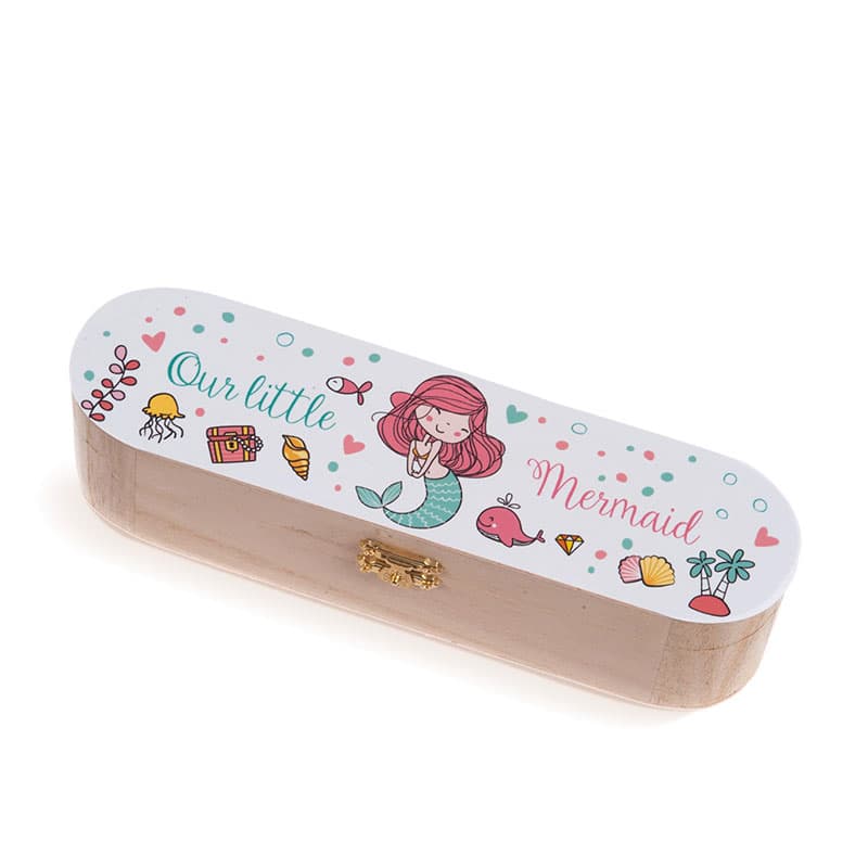 Ξύλινη natural κασετίνα με μεταλλικό κούμπωμα. Είναι διακοσμημένη με αυτοκόλλητο print Γοργόνα.
