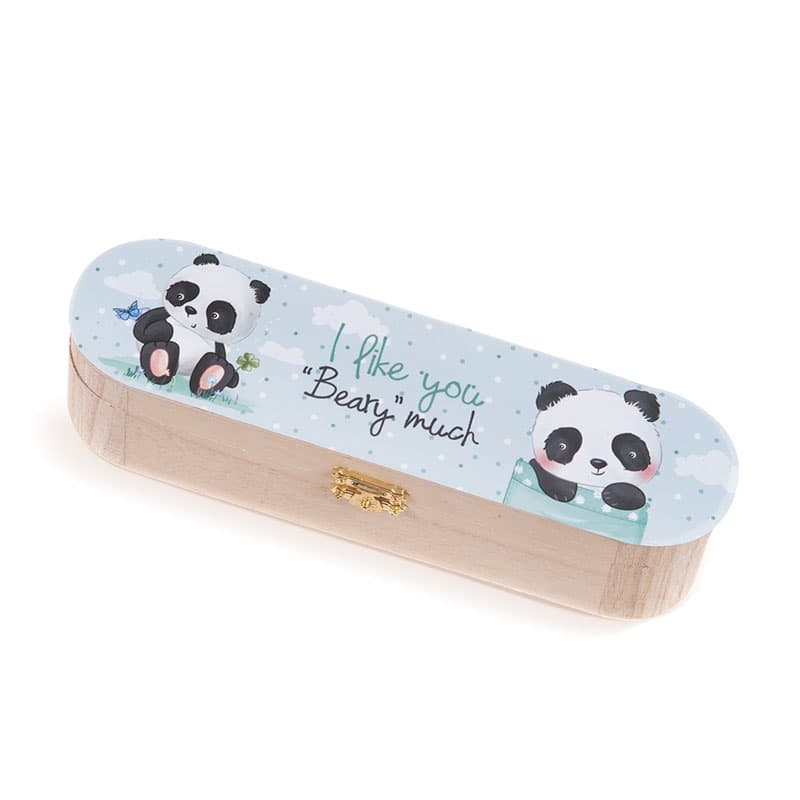 Ξύλινη natural κασετίνα με μεταλλικό κούμπωμα. Είναι διακοσμημένη με αυτοκόλλητο print Panda.
